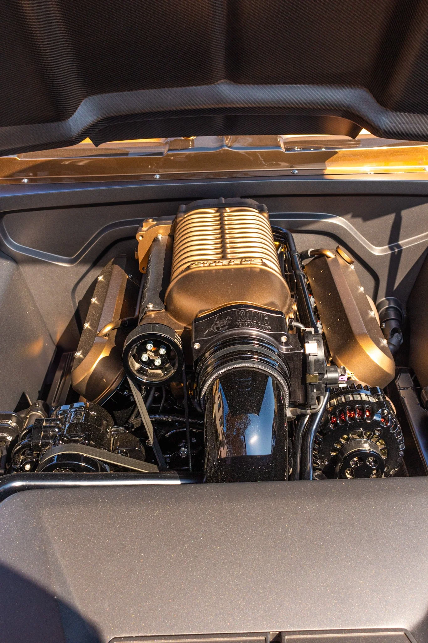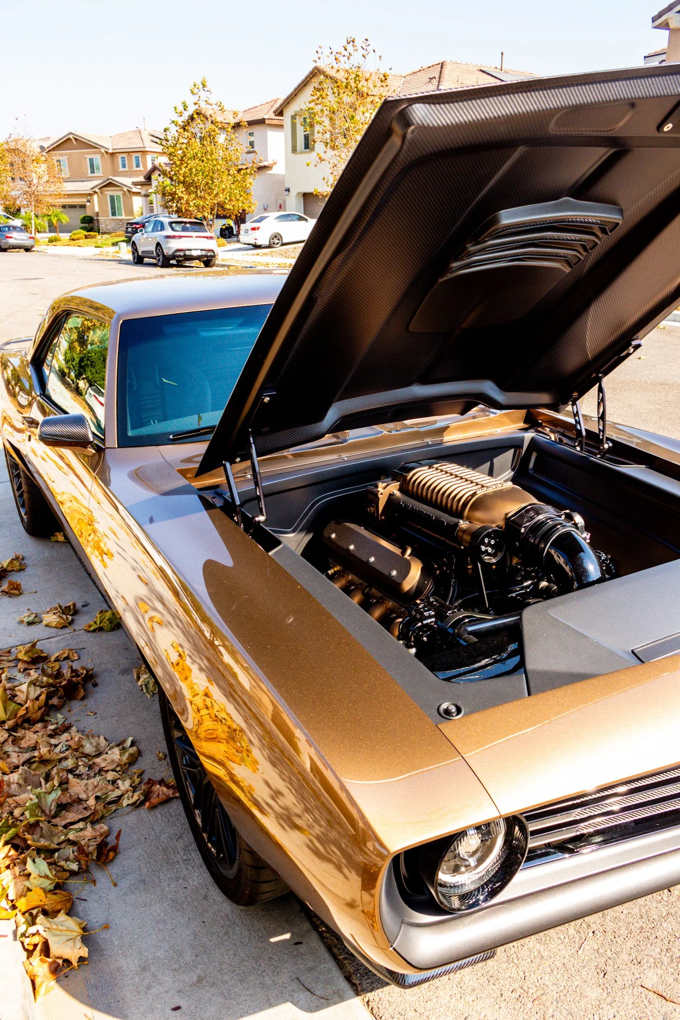 This ride isn’t just a car—it’s a statement. Wrapped in a flawless bronze finish with sleek carbon-fiber accents, it reflects every detail of its surroundings while demanding attention of its own. Sitting low and wide on blacked-out commission wheels, it blends old-school muscle with modern-day aggression. Every curve, every reflection, and every detail tells the story of power, passion, and style. This isn’t about transportation—it’s about presence.